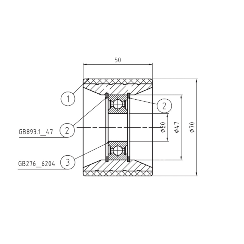 El núcleo de la rueda con núcleo de aluminio está hecho de aleación de aluminio. La aleación de aluminio tiene alta resistencia, buena resistencia a la corrosión y es liviana, lo que permite que el rodillo mantenga un peso total liviano mientras soporta cargas pesadas, lo que reduce la carga sobre el sistema de escaleras mecánicas. ; El diámetro exterior es de 70 mm, la altura es de 50 mm y está equipado con rodamientos rígidos de bolas 6204; el rodillo adopta un diseño estructural razonable para garantizar un funcionamiento estable en el sistema de escaleras mecánicas y al mismo tiempo reducir la vibración y el ruido.